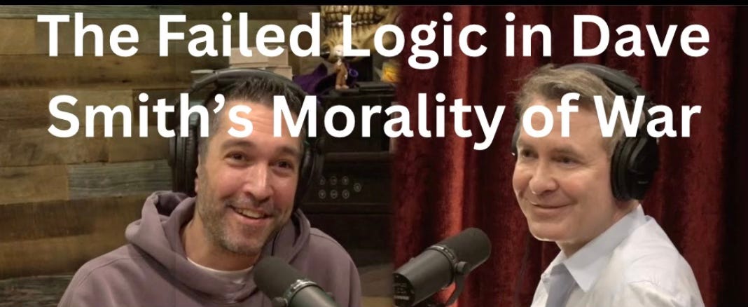 Dave Smith, a libertarian comic, has taken to the world’s biggest podcasts—including a recent debate with me onPiers Morgan Uncensored—to argue that war should be judged by the same moral logic as domestic murder. He claims “war” is just a word politicians use to seize power, not a meaningful shift in moral reality. Given the size of his audience and the intensity of public reaction, it’s worth answering his claims head-on.